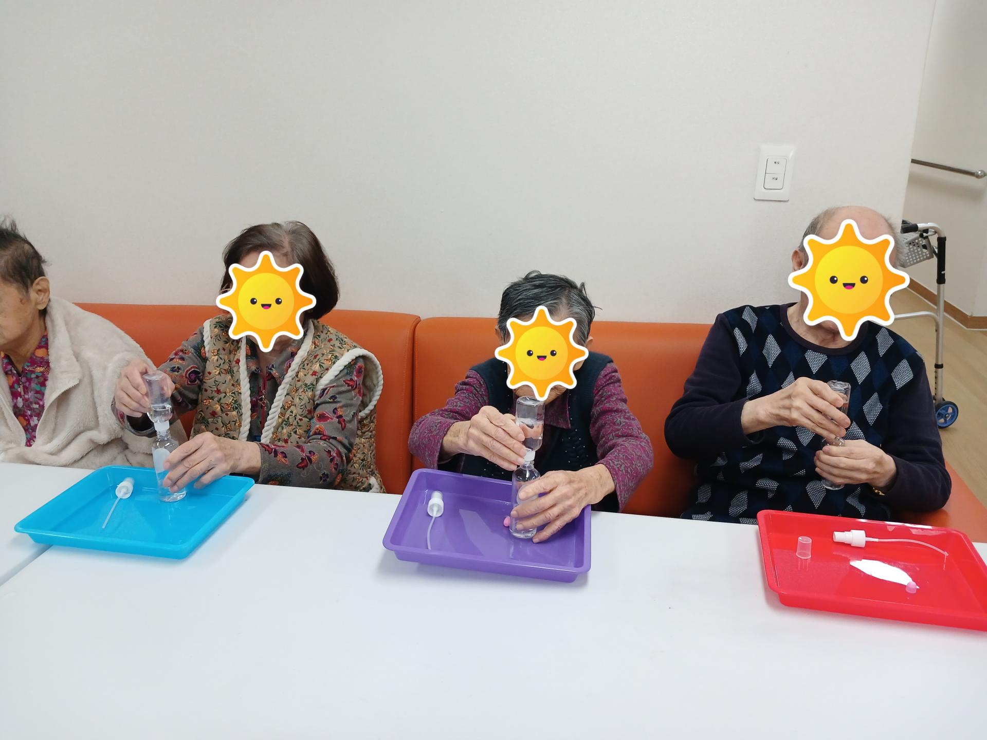 독감유행과 쌀쌀하고 건조해진 날씨로 손 소독제를 에탄올과 글리세린을 섞어 소독제를 직접 만들어보고 생 알로에를 잘라 알로에 진액을 손과 얼굴에 발라보며 피부보습과 촉촉한 피부를 위해 어르신들이 적극적으로 참여하셨습니다.