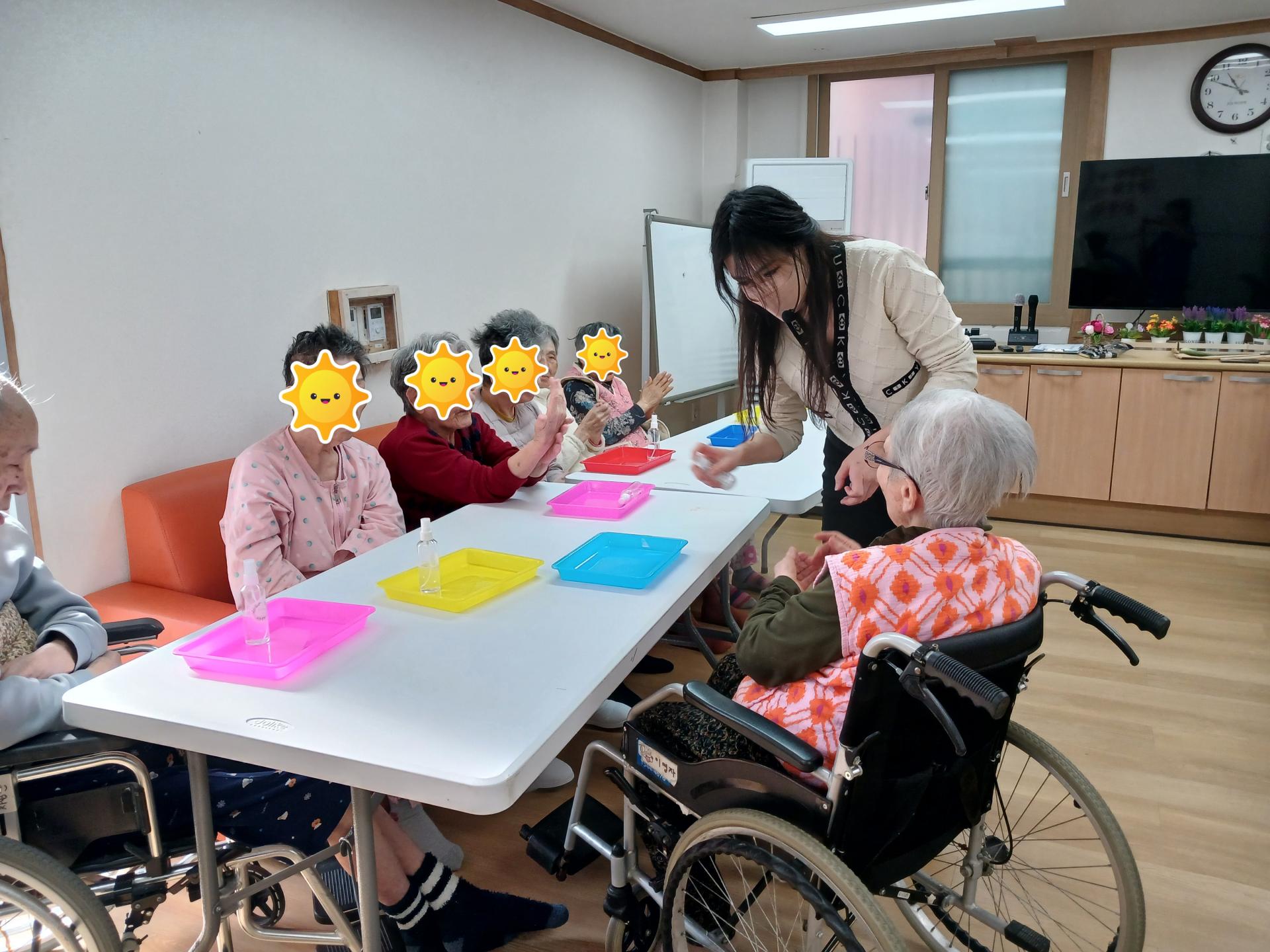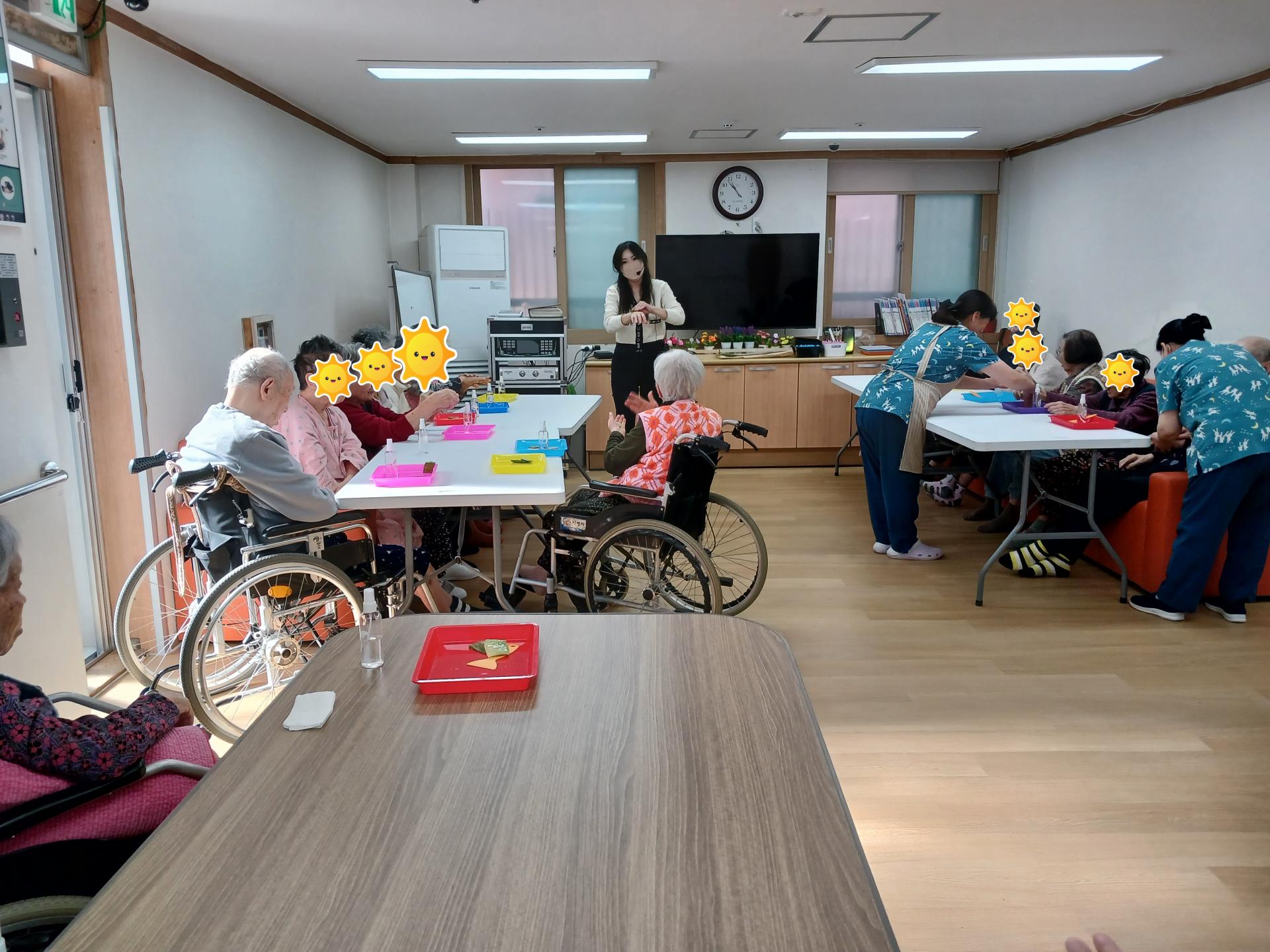 흥겨운 노래와 율동을 곁들이며 혹시나 입에 넣는 어르신이 계시지 않도록 주의하며 직접 만들고 경험해 보는 즐거운 시간이었습니다.